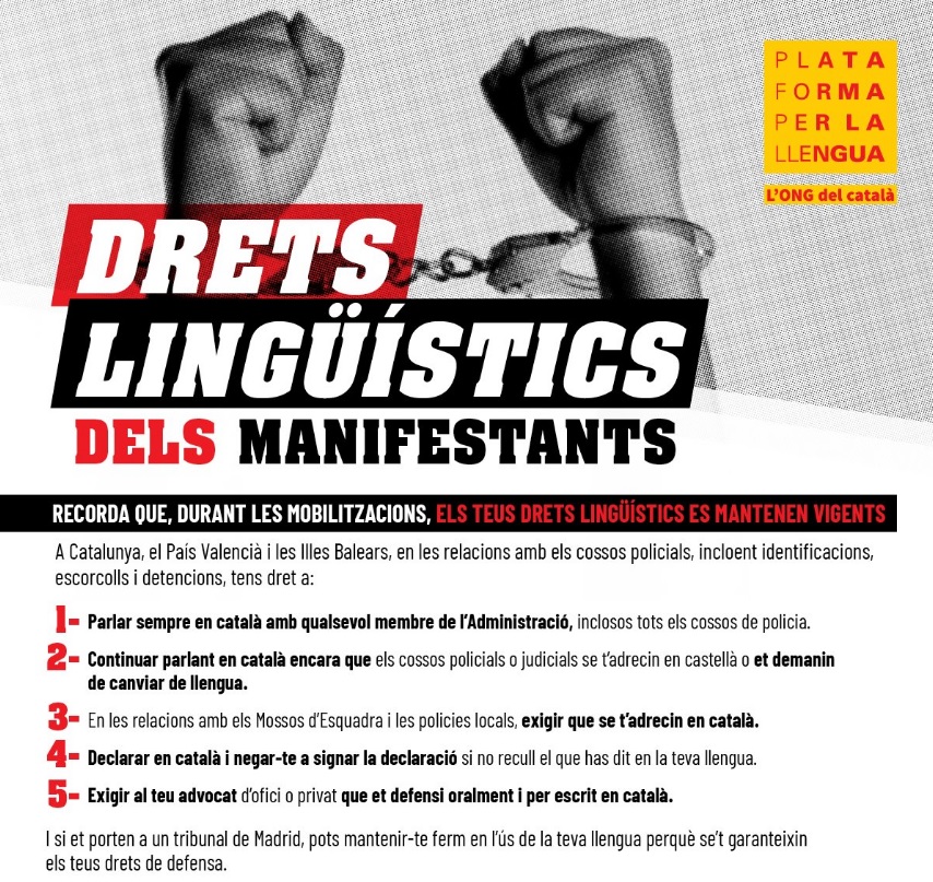 La Plataforma per la Llengua ha difós unes recomanacions per fer valdre els drets lingüístics dels ciutadans quan aquests participin en manifestacions i mobilitzacions, com passa aquests dies en molts indrets del país. L’entitat dona una sèrie de pautes, especialment a l’hora de comunicar-se amb la policia i el personal judicial, estaments sovint poc receptius al català i a altres llengües minoritzades.