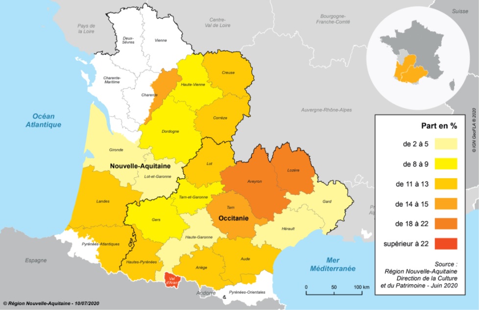 L’Enquesta sociolingüística 2020, feta en aquesta edició a 8.000 persones d’un territori de més de 600.000 persones, mostra una gran disparitat de percentatge de parlants d’occità en funció dels territoris, que va des del 2% de llocs molt urbanitzats com l’Alta Garona, la Gironda i l’Herau fins al 22% de territoris poc poblats com la Charanta occitana i el Losera i el 62% de persones que el saben parlar a la Vall d’Aran.