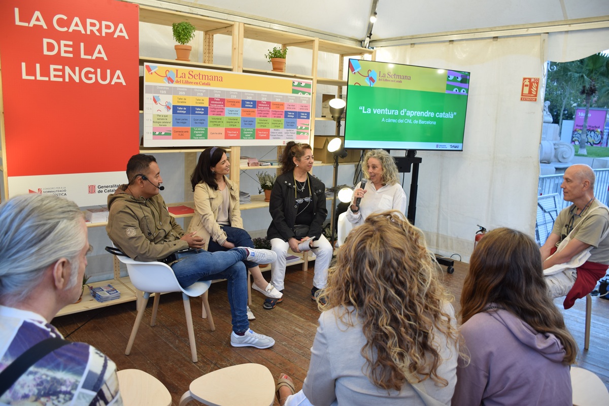 Foto: Taula rodona ‘La ventura d’aprendre català’ a la Carpa de la Llengua de la Setmana del Llibre en Català / Raül G. Aranzueque