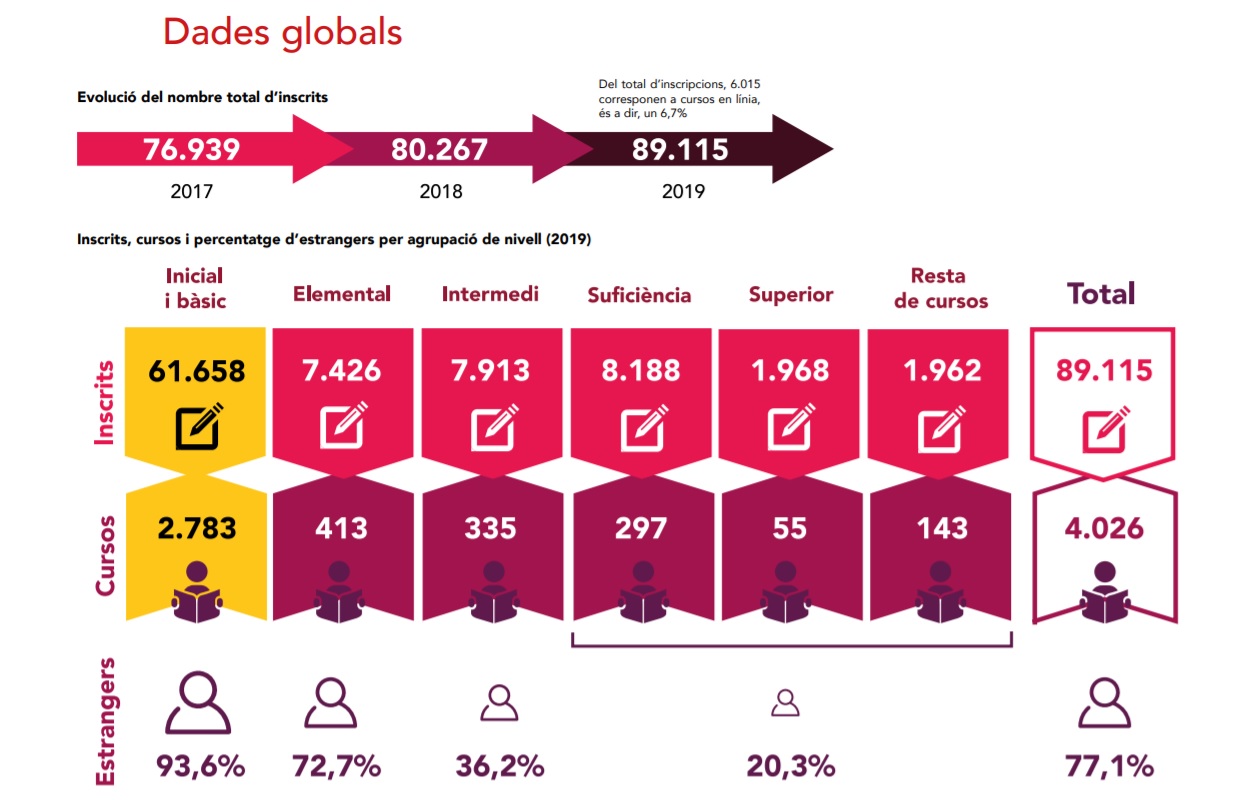 El nombre d’inscrits en els cursos presencials del Consorci per a la Normalització Lingüística (CPNL) de la Generalitat de Catalunya va augmentar un 11% el 2019 respecte de l’any anterior i el de cursos, un 8,6%. Segons la Memòria 2019 del CPNL, l’any passat es van organitzar un total de 4.026 cursos presencials en els quals van participar 89.115 alumnes. La major part dels inscrits van seguir la formació en nivells inicials i bàsics, adreçats a nouvinguts.