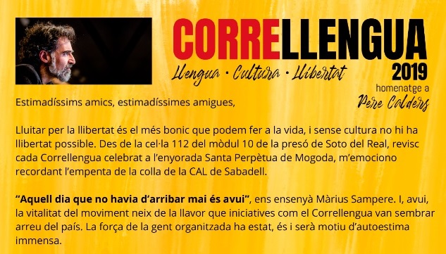 En el manifest, Cuixart explica que, des de la cel·la on està tancat, reviu “cada Correllengua celebrat a l’enyorada Santa Perpètua de Mogoda” i que s’emociona “recordant l’empenta de la colla de la CAL de Sabadell”. Cuixart fa referència a l’objectiu de l’edició d’aquest any del Correllengua, fer que les persones que no tenen el català com a llengua materna se’l facin seu, i remarca que, en una societat com la catalana, “on el fet migratori és estructural, la lluita per la plena normalització de la llengua i la cultura catalanes és un gran consens de país”. “Mantenim la voluntat de compartir el català, des de l’escola fins a la feina, des del carrer fins al cinema i els mitjans de comunicació”, diu el president d’Òmnium.