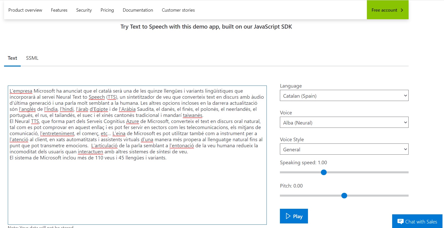El Neural TTS, que forma part dels Serveis Cognitius Azure de Microsoft, converteix el text en discurs oral natural, tal com es pot comprovar en aquest enllaç i es pot fer servir en sectors com les telecomunicacions, els mitjans de comunicació, l’entreteniment, el comerç, etc… L’eina de Microsoft es pot utilitzar també com a instrument per a l’atenció al client, en xats automatitzats i assistents virtuals d’una manera més propera al llenguatge natural fins al punt que pot transmetre emocions.  L’articulació de la parla semblant a l’entonació de la veu humana redueix la incomoditat dels usuaris quan interactuen amb altres sistemes de síntesi de veu.