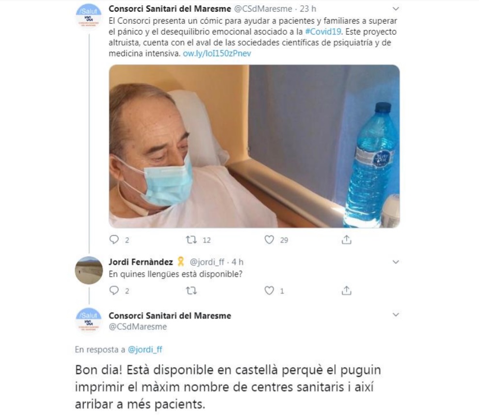 L’entitat denuncia que el Consorci ha editat un còmic divulgatiu sobre la Covid-19 destinada a abordar el patiment psicològic derivat de la malaltia únicament en castellà. A la pregunta d’un usuari de Twitter sobre els idiomes en què estava editada la publicació, el Consorci va respondre que “està disponible en castellà perquè el puguin imprimir el màxim nombre de centres sanitaris i així arribar a més pacients”. L’ens ofereix una versió amb els globus del còmic buits per a qui els vulgui traduir.