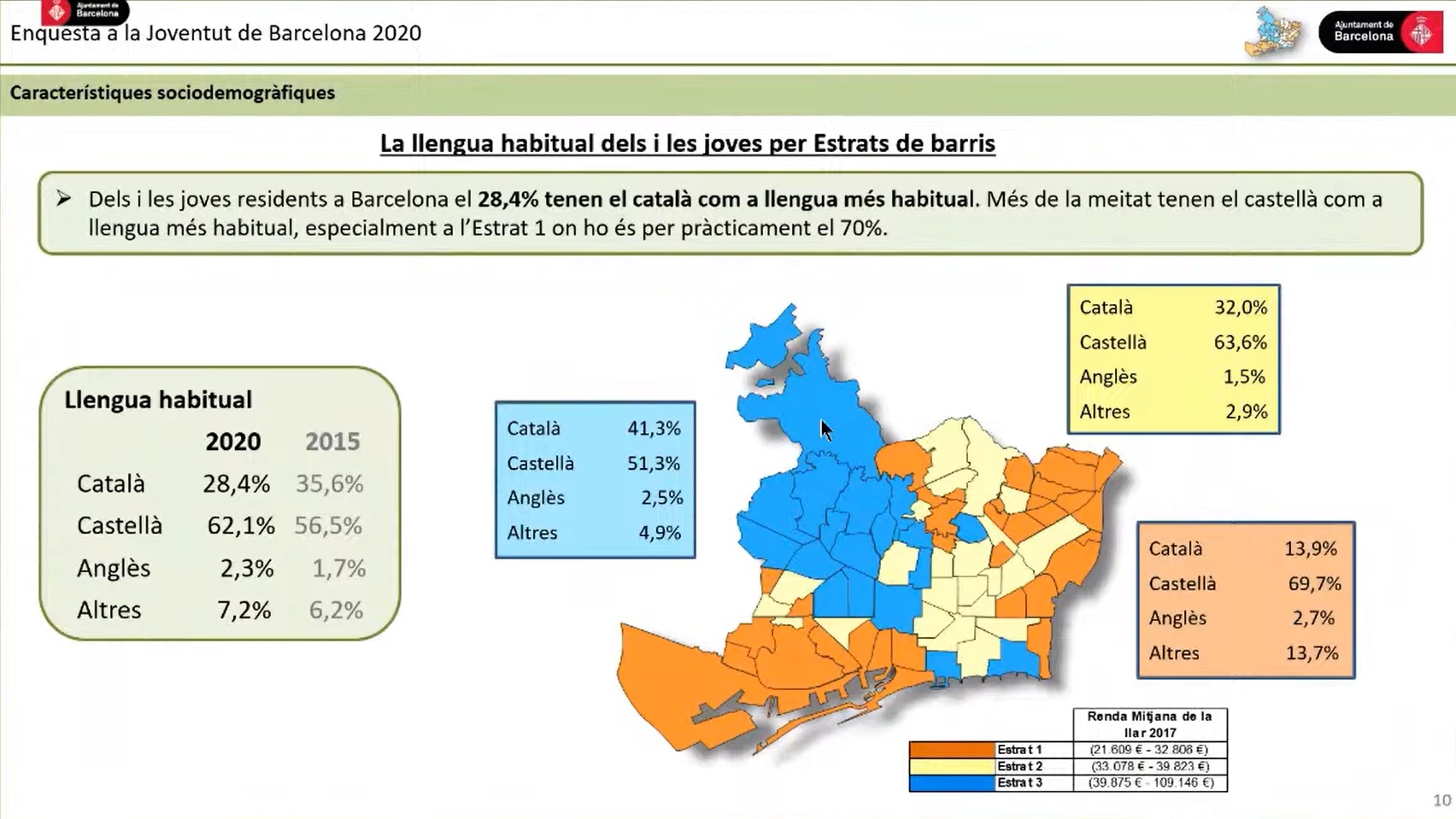 El percentatge de joves que parlen habitualment el català és set punts més baix que els de l’enquesta que es va fer el 2015 (un 35,6%), però la comparació és enganyosa perquè les dades de l’any passat recullen els hàbits dels joves que fa un mínim de sis mesos que viuen a Barcelona, mentre que les de fa sis anys feien referència als empadronats a la ciutat. El regidor d’Infància, joventut, persones grans i persones amb discapacitat, Joan Ramon Riera, ha justificat, en la presentació dels resultats, el canvi de mètode per la necessitat de reflectir millor la realitat de la ciutat. Cal tenir en compte que del total d’enquestats només el 42% han viscut sempre a Barcelona i el 13,4% no hi estan empadronats.
