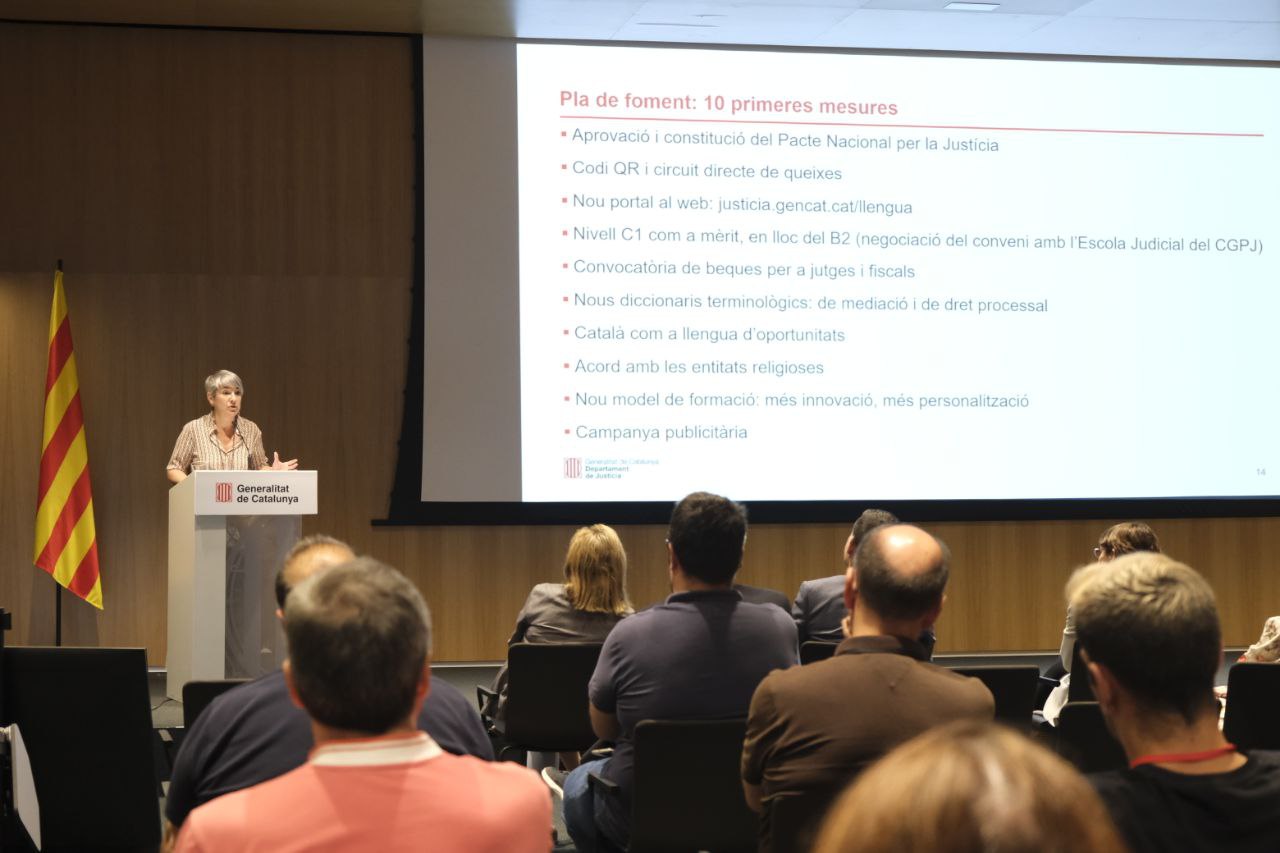 Davant la situació precària del català en la justícia, el govern aprovarà un Pacte Nacional per la Justícia que aplegarà actors diversos de l’àmbit lingüístic i el món judicial: universitats, notaria, procuradoria, entitats del tercer sector, institucions públiques i privades. Entre les mesures que inclourà el pla hi ha l’establiment d’un circuit directe amb l’Administració per a queixes relacionades amb la vulneració de drets lingüístics als jutjats, una iniciativa que ja està en funcionament. A través d’un codi QR, els afectats poden posar en coneixement de l’Administració la vulneració dels seus drets lingüístics, directament des del seu mòbil i en el mateix lloc i moment en què s’hagi produït la vulneració d’aquests drets. Les queixes rebudes també serviran per documentar les vulneracions i traslladar-les a l’òrgan que pertoqui.