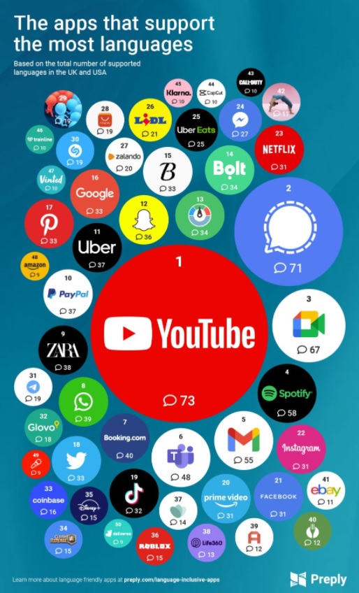 Segons l’estudi de Preply, YouTube és l’aplicació que més idiomes ofereix (73), seguida de Signal (71). Meet (67) i Spotify (58).