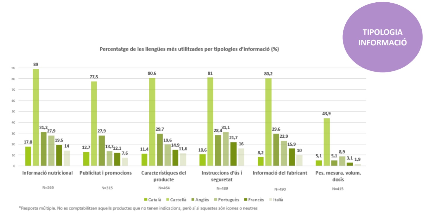 Segons l’informe, el català només apareix en el 17,8% dels casos en la informació nutricional dels productes, en un 11,4% de les característiques i en un 10,6% de les instruccions d’ús i de seguretat. Per productes, el de les begudes és el que registra un percentatge més alt de presència de la llengua pròpia en l’etiquetatge (35,3%), mentre que en els electrodomèstics i l’electrònica el percentatge és del 2,9%. Pel que fa als sectors, el dels vins i caves és el més sensible amb el català i el 70% dels productes estan etiquetats almenys en aquesta llengua, mentre que el del calçats i els complements és a la cua amb un 3,6% dels productes.