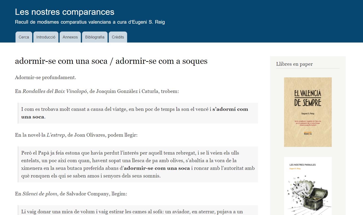 L’escriptor i lingüista Eugeni S. Reig, que ha publicat diverses obres lexicogràfiques, confia que aquesta nova eina sigui útil perquè les noves generacions d’escriptors enriqueixin el seu vocabulari. L’autor de Les nostres comparances recorda, en la introducció del recull, que “una bona part de les expressions que habitualment usem en la nostra parla quotidiana tenen el seu origen en una comparança” i remarca que seria “molt lamentable” que es perdés “una gran quantitat dels modismes comparatius que l’enginy del poble valencià ha creat al llarg dels segles” i els nous que també es creen actualment.