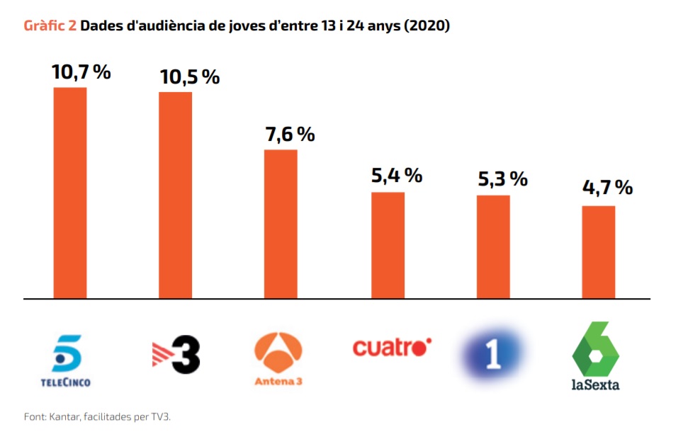 Segons aquest estudi, que cita dades de Kantar, facilitades per la Corporació Catalana de Mitjans Audiovisuals (CCMA), la població d’entre 13 i 24 anys va consumir l’any 2020 75 minuts diaris de televisió de mitjana, una xifra molt més baixa que els 221 minuts de la població general. TV3, que és líder d’audiència a Catalunya, va acabar en segona posició entre el públic jove (10,5% de quota de pantalla), per darrere de Telecinco (10,7%). Seguien aquests dos canals Antena3 (7,6%), Cuatro (5,4%), La1 (5,3%) i La Sexta (4,7%).