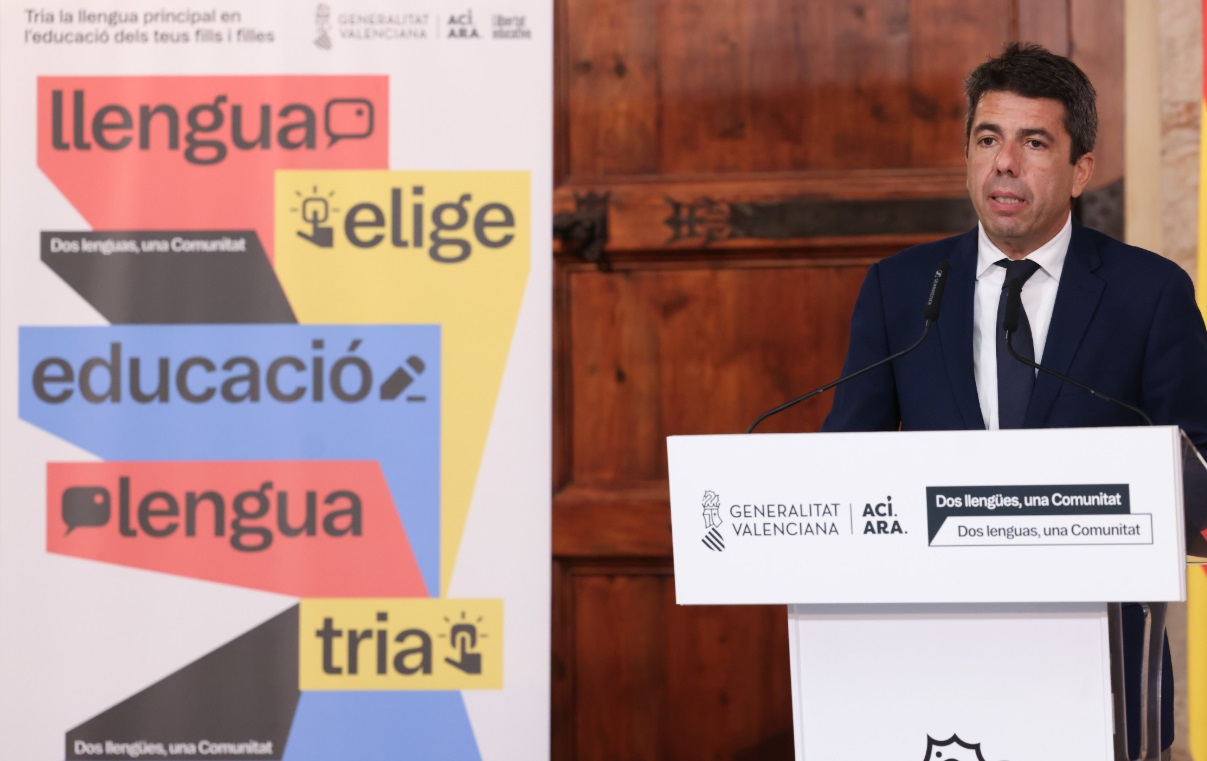 Foto: El president de la Generalitat Valenciana, Carlos Mazón, en la presentació de la consulta de la llengua base a les escoles / GVA
