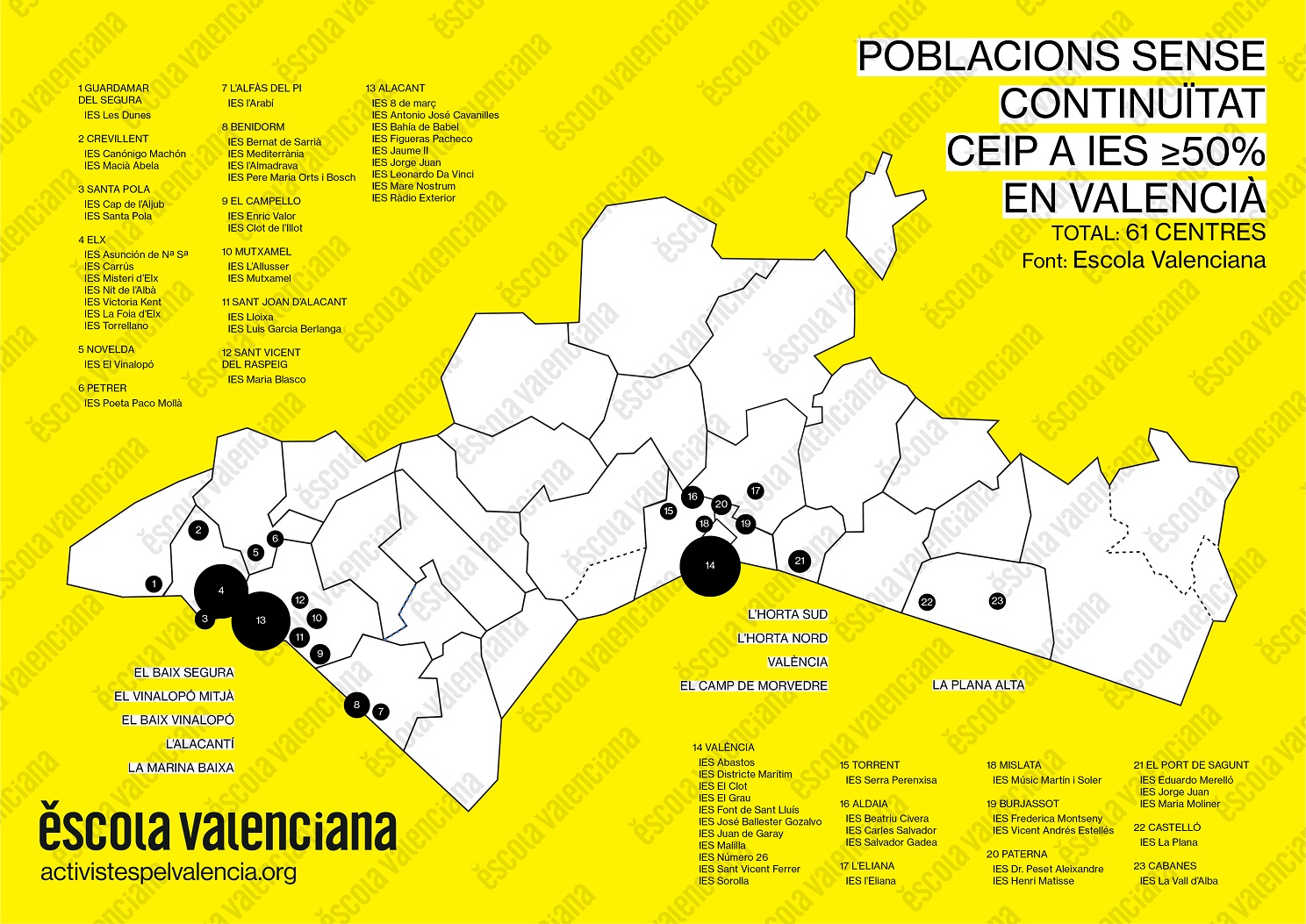 Escola Valenciana ha presentat a la Conselleria d’Educació un informe que analitza l’aplicació de la Llei de Plurilingüisme als instituts el pròxim curs en el qual reclama que es garanteixi l’ensenyament en valencià als alumnes que han seguit aquest model a primària. L’informe assenyala que hi ha 61 centres de secundària on l’ensenyament en la llengua pròpia està en perill a causa de l’aplicació del Programa d’Educació Plurilingüe i Intercultural (PEPLI) a secundària, que no garanteix un mínim del 50% de les hores lectives en valencià.