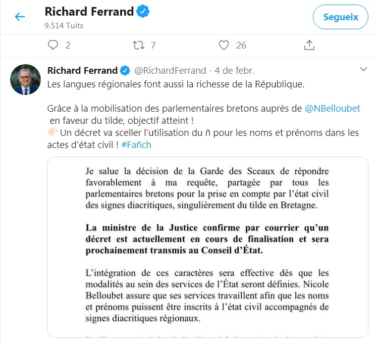 “Les llengües regionals són part de la riquesa de la República. Gràcies a la mobilització dels parlamentaris bretons i a Nicole Belloubet [ministra de Justícia francesa] […] hem assolit l’objectiu! Un decret segellarà l’ús de la ñ per als cognoms i noms en els documents d’estat civil!”, diu el president de la cambra legislativa francesa, que acaba la piulada amb el coixinet #Fañch, en referència a la lluita reeixida d’uns pares bretons perquè el seu nadó, de nom Fañch, pogués ser inscrit amb la grafia de la seva llengua.