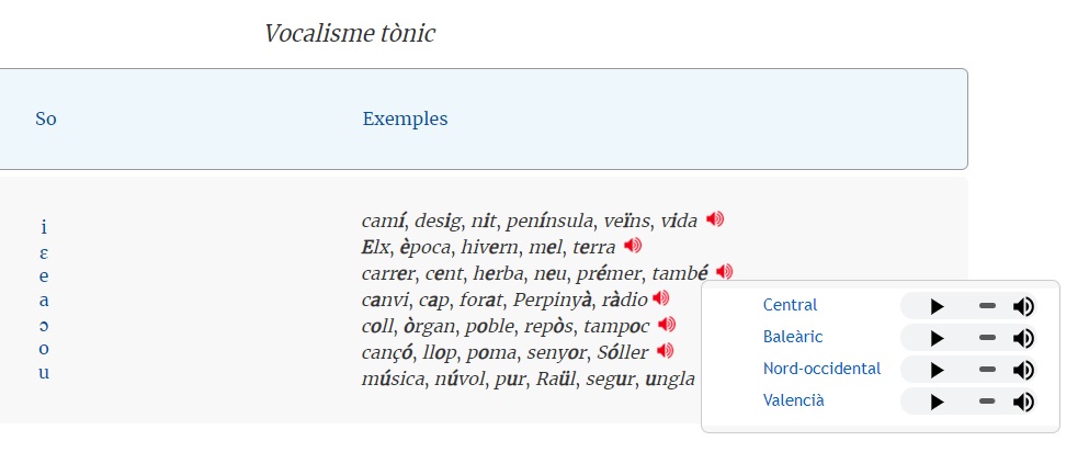 Per fer-ho, s’ha de fer clic sobre la icona d’àudio, que dona  accés a la reproducció d’un fitxer de so en format MP3, quan conté la pronúncia d’un únic parlar o bé a una finestra emergent amb accés a diferents parlars. En general, s’il·lustren els fenòmens descrits en els quatre grans parlars (central, baleàric, nord-occidental i valencià), per a la qual cosa s’ha enregistrat cada exemple amb una veu femenina i una altra de masculina i posteriorment se n’ha triat una.
