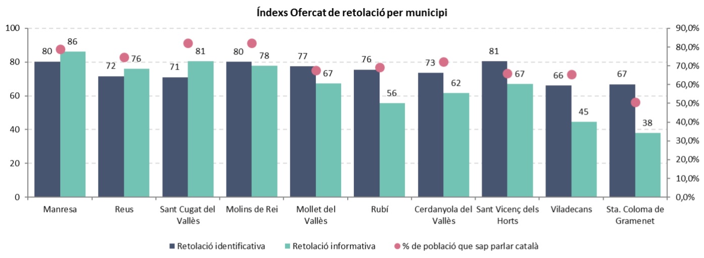 La presència del català en la retolació té una certa correlació amb la proporció de població que sap parlar català en cada població, tot i que hi ha diferències notables entre el percentatge de ciutadans que sap parlar la llengua a Rubí, Viladecans i Santa Coloma de Gramenet, que oscil·la entre el 50% i el 70% i el de retolació informativa, que està entre el 38% i el 56%.