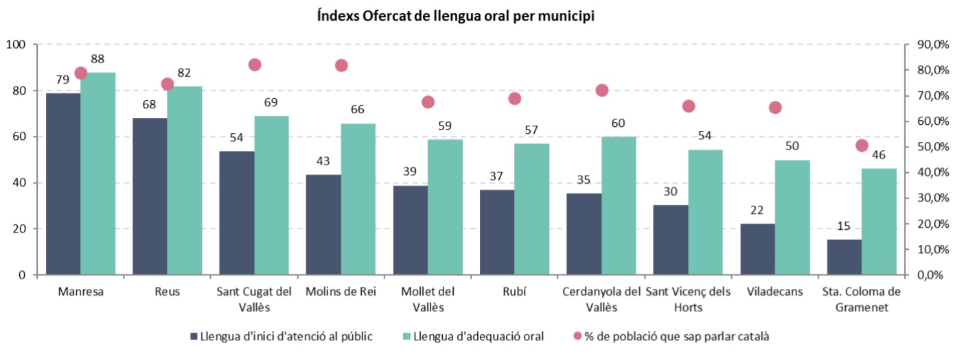 Les diferències més accentuades es donen, però, en l’atenció oral, on només hi ha una correlació important entre la llengua que saben parlar els ciutadans i l’idioma en què són atesos a Manresa i Reus. A totes les ciutats, però, el percentatge de dependents que s’adeqüen a la llengua en què els parla el client si ho fa en català, encara que en primer terme se’ls hagin adreçat en castellà, és notable. En el cas de Santa Coloma de Gramenet, tot i que el percentatge de vegades en què els treballadors dels establiments s’adrecen, d’entrada, en català als clients és només del 15%, l’índex d’adequació a la llengua del seu interlocutor si aquest els parla en català és el triple (46%). Val a dir que en aquesta ciutat el percentatge de ciutadans que saben parlar català és de prop del 50%.