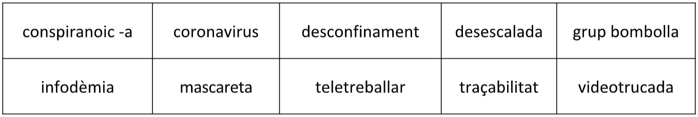 Les paraules relacionades amb la pandèmia del coronavirus han colonitzat llista de candidates a neologisme de l’any que organitza l’Observatori de Neologia de la Universitat Pompeu Fabra i l’Institut d’Estudis Catalans (IEC) i que s’ha fet pública aquest dijous. Conspiranoic, coronavirus, desconfinament, desescalada, grup bombolla, infodèmia, mascareta, teletreballar, traçabilitat i videotrucada competiran pels vots dels usuaris, que poden participar en l’elecció de la setena edició del neologisme de l’any a través del formulari del web neologisme.cat.