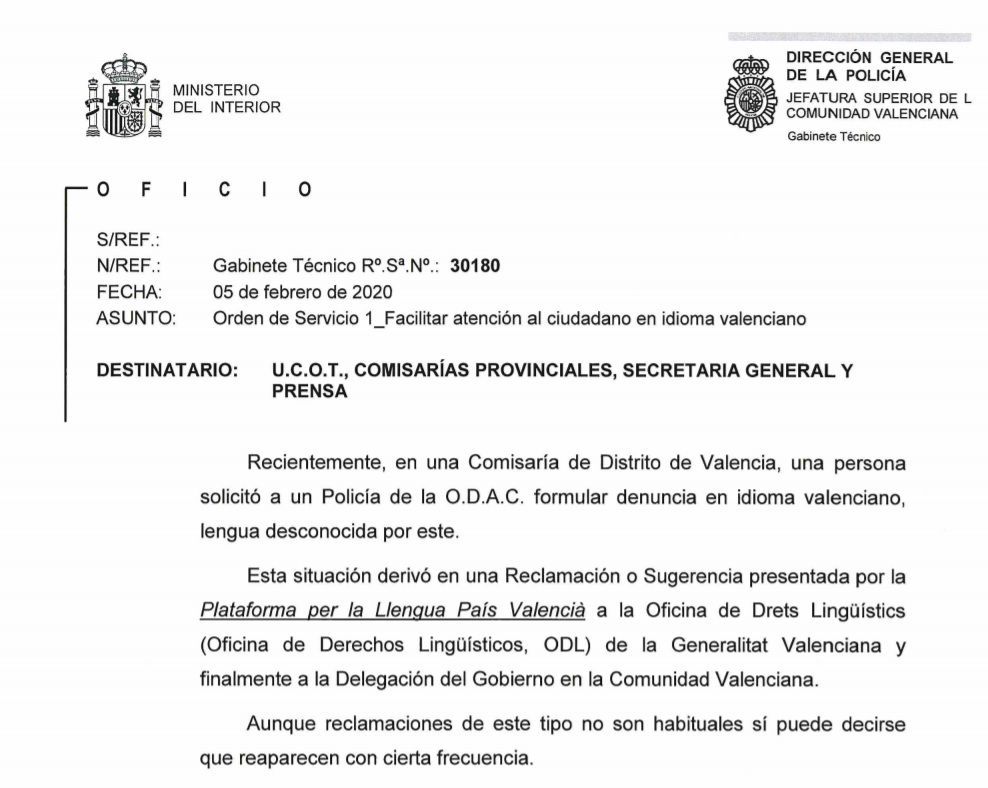 La prefectura superior del País Valencià de la Direcció General de la Policia ha demanat que als espais policials on s’ofereix atenció directa a la ciutadania com les oficines de denúncies i atenció a la ciutadania o a les oficines on es fa la documentació com el DNI o el passaport es “procuri” “, “en la mesura que sigui possible, que cada torn tingui almenys un funcionari que pugui atendre en valencià”. En cas que això no fos possible, “es requerirà la presència d’un policia d’un altre servei o es demanarà de manera cortès al ciutadà perquè comparegui en un altre moment en què puga comptar amb aquesta possibilitat”.