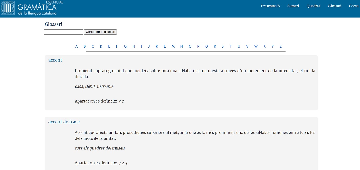 La Secció Filològica de l’Institut d’Estudis Catalans (IEC) ha obert al públic el Glossari de termes gramaticals, un recull terminològic en línia que conté 700 articles corresponents a termes gramaticals dels camps de la fonètica, la morfologia i la sintaxi.