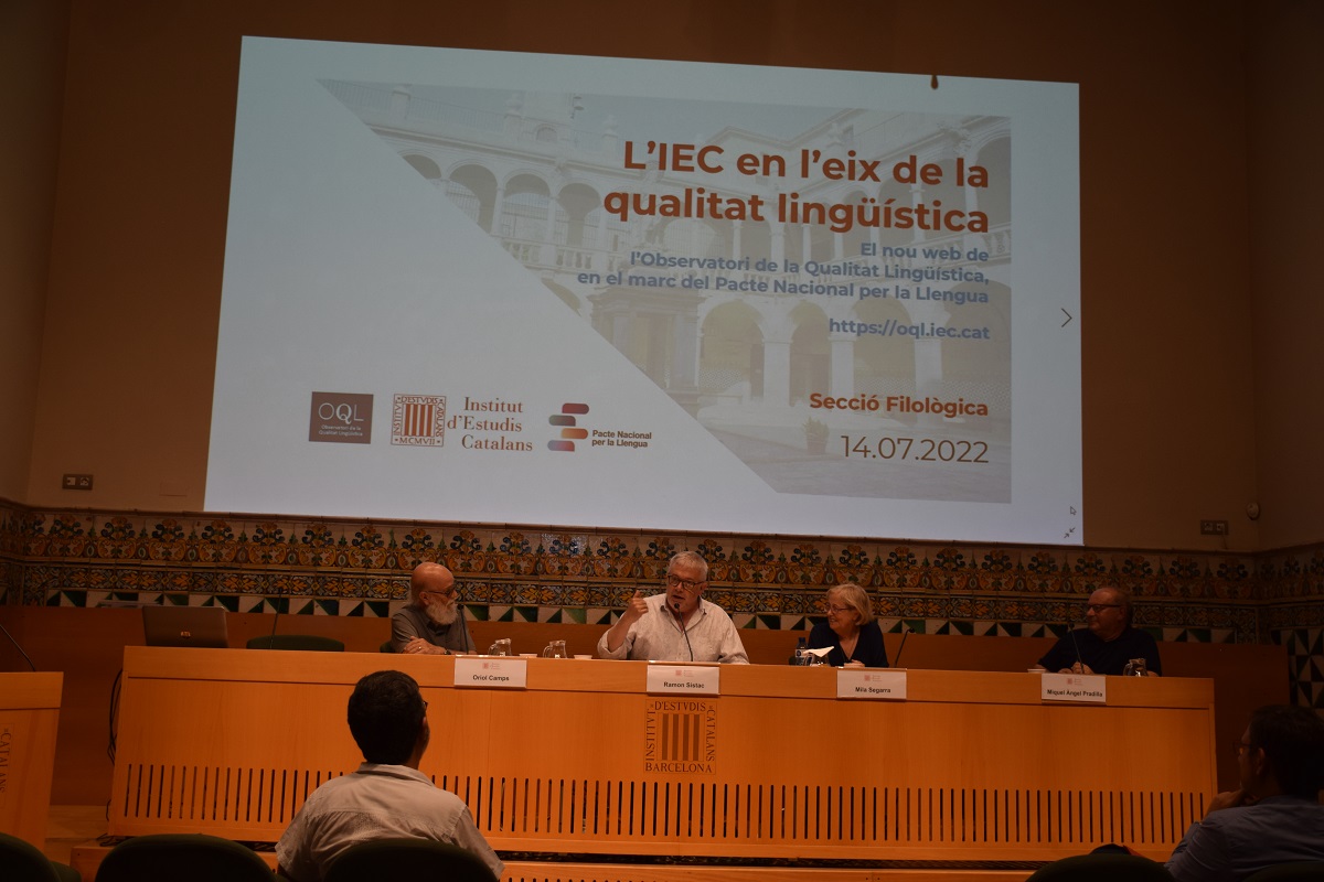 La Secció Filològica (SF) de l’Institut d’Estudis Catalans (IEC) va presentar dijous el nou web de l’Observatori de la Qualitat Lingüística (OQL), un projecte destinat a fer un seguiment i una avaluació dels usos públics de la llengua catalana en les diverses varietats dialectals i ajudar a millorar-los. La iniciativa s’inscriu en el marc del Pacte Nacional per la Llengua (PNL).