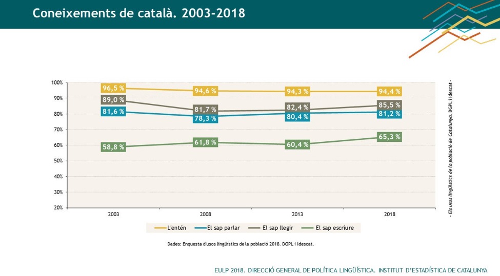 L’esperada Enquesta d’Usos Lingüístics de la Població (EULP) de Catalunya del 2018, feta púbica aquest dilluns, ha confirmat les tendències dels darrers anys. Cada cop hi ha més gent que sap parlar, llegir i escriure el català, però l’ús social continua estancat i el percentatge de persones que tenen la llengua pròpia del país com a habitual és del 36,1%, dues dècimes menys que en l’enquesta de fa cinc anys i gairebé deu punts per sota del 46% del 2003.