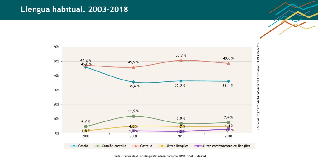Les dades del 2018 tornen a mostrar un decalatge entre els ciutadans que tenen el català com a llengua inicial (31,5%) i els que el tenen com a llengua d’identificació (36,3%), un indicador, aquest últim, molt rellevant per a l’ús de l’idioma. El problema és que aquests dos indicadors es mantenen estancats, amb variacions mínimes, des del 2008. En el cantó positiu hi ha el fet que els joves parlen tant o més el català que el castellà en les seves converses.
