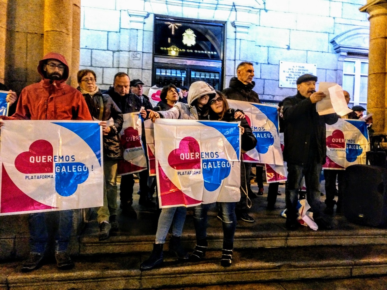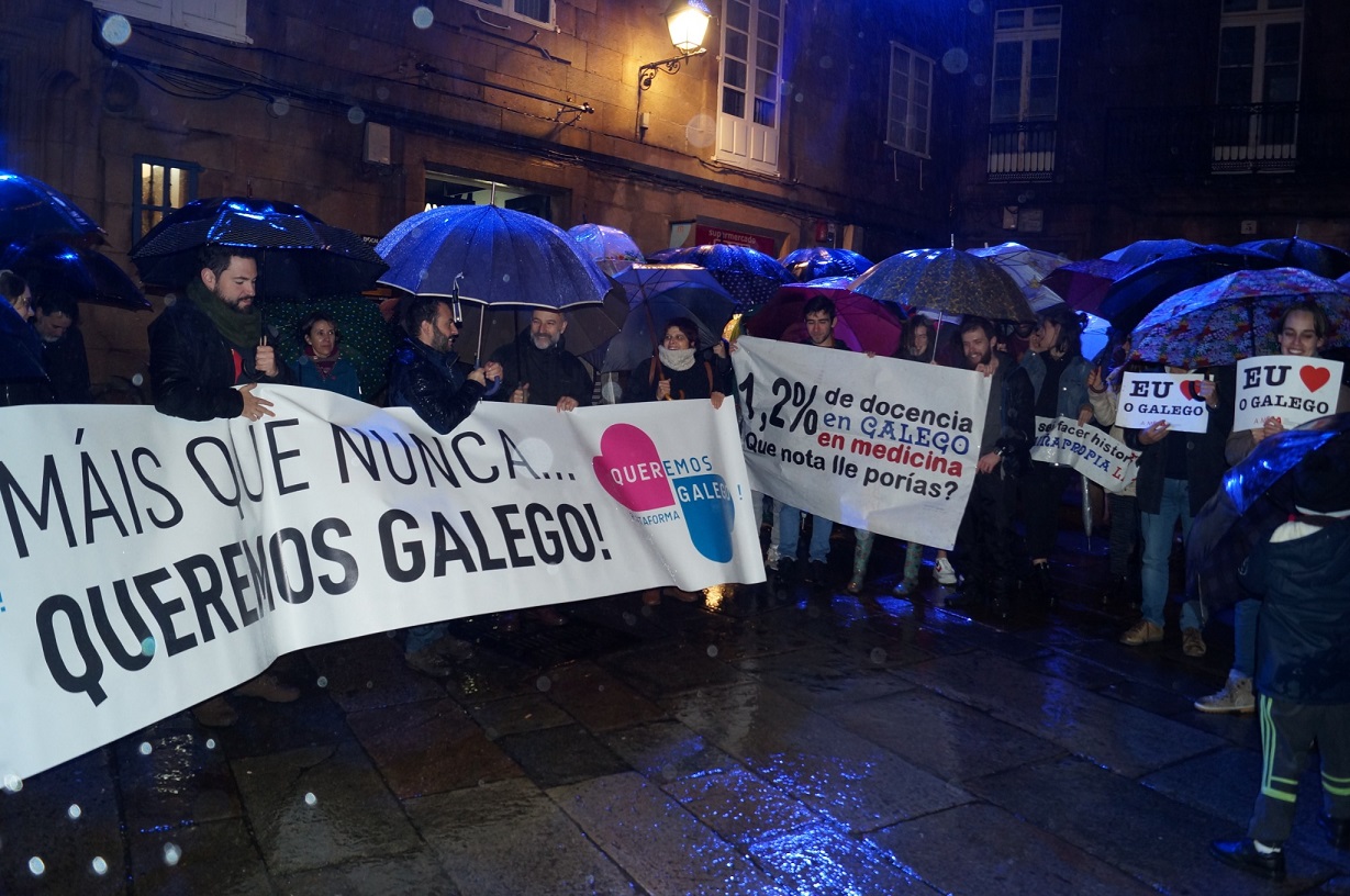 Convocats per la plataforma Queremos Galego i sota el lema Emergència lingüística. Necessitem el gallec, centenars de persones es van aplegar al vespre, sota una pluja intensa, a set ciutats de Galícia, per reclamar els seus drets lingüístics. Els manifestants van corejar lemes com “A Galícia, en gallec” i van reclamar que es reverteixi el decret de la Xunta de l’any 2010 que, segons van denunciar, exclou una educació plena en gallec i deixa el castellà com a “idioma predominant” en l’ensenyament.