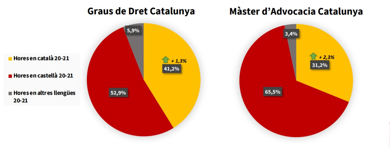 L’estudi revela que només la Universitat Oberta de Catalunya (UOC) ofereix la possibilitat de matricular-se a totes les assignatures en català, mentre que a la Universitat de Barcelona (UB), que és on es fan un el 40% de les hores lectives del grau de Dret a Catalunya, el català només és majoritari en el 13% de les assignatures.