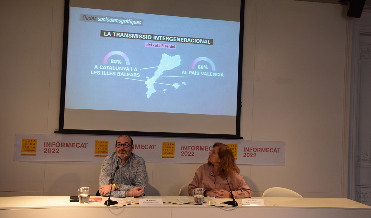 La Plataforma per la Llengua ha presentat aquest dilluns l’Informecat 2022, el document en què l’entitat recull anualment les cinquanta dades més rellevants del darrer any sobre el català, en el qual l’entitat destaca aspectes positius com la transmissió intergeneracional de la llengua, especialment a Catalunya (on el 81,9 % dels residents amb, com a mínim, un avi catalanoparlant tenen el català com a llengua habitual), i d’altres de negatius com la poca consciència de la fragilitat de la seva llengua de molts catalanoparlants.