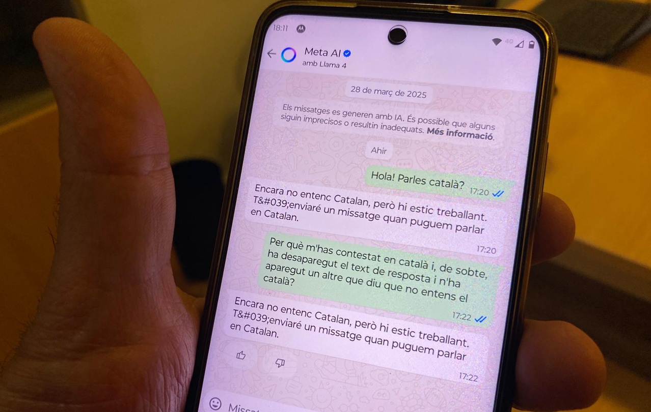 Els usuaris catalanoparlants de Whatsapp, Instagram i altres aplicacions de Meta, la casa matriu d’aquestes eines i de Facebook, s’han trobat des d’aquest diumenge que als seus dispositius hi ha aparegut la possibilitat d’interactuar amb un xatbot d’intel·ligència artificial, però no en català. El fet curiós, però, és que molts usuaris de Whatsapp s’han adonat que el xatbot els contesta, en un català correcte, la primera interpel·lació que li fan, però al cap d’un instant -menys d’un segon- la resposta desapareix i, en el seu lloc hi apareix un missatge matusser que diu “Encara no entenc Catalan, però hi estic treballant. T'enviaré un missatge quan puguem parlar en Catalan.”