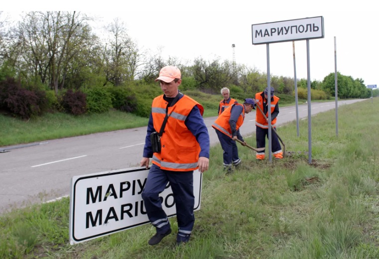 Foto: Operaris russos retiren rètols en ucraïnès i els substitueixen per rètols en rus