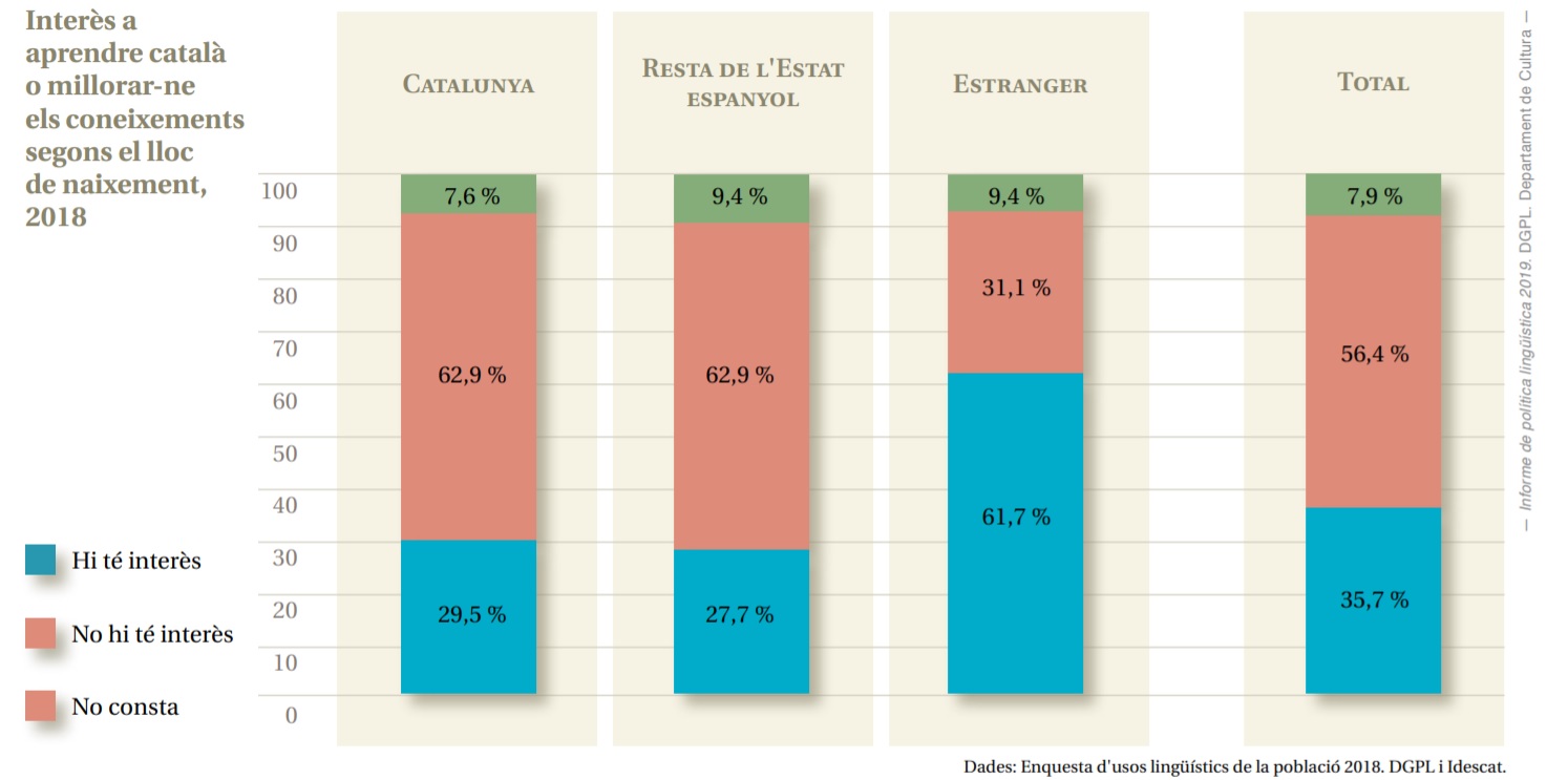 L’Informe de Política Lingüística 2019 remarca l’interès pel català dels nouvinguts. Segons l’Enquesta d’Usos Lingüístics de la Població (EULP) del 2018, prop de 800.000 persones nascudes a l’estranger tenen interès a aprendre’l o a millorar-ne els coneixements. L’interès per la llengua s’ha traduït també en un elevat nombre d’inscrits en els exàmens per a l’obtenció de certificats oficials de català (33.165 l’any 2019).