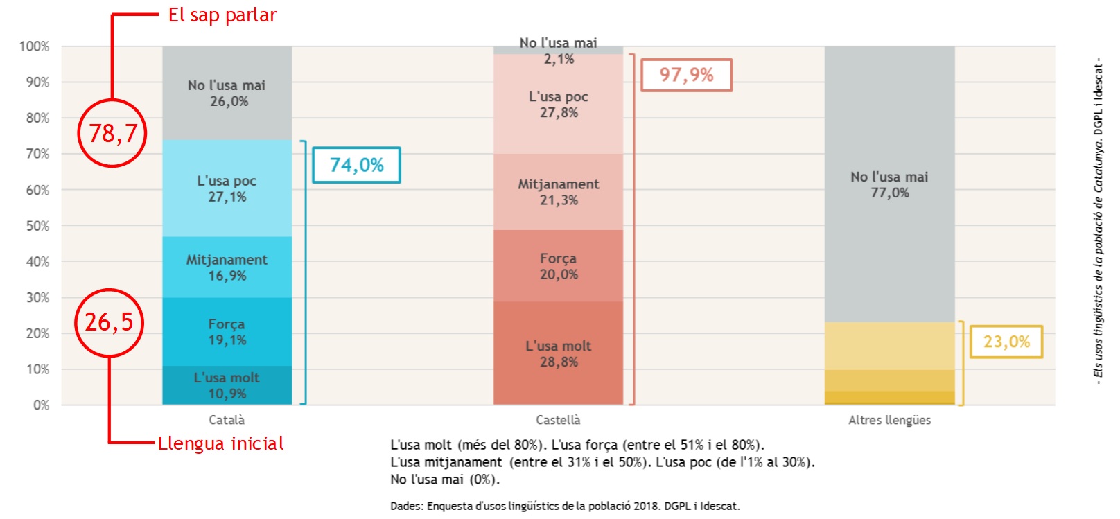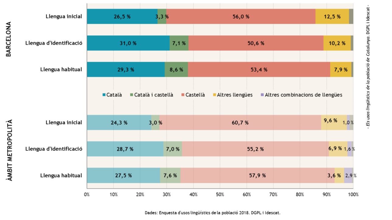 Les dades d’ús del català a Barcelona són sensiblement inferiors a les del conjunt de Catalunya on el 36,1% el fa servir molt o força, i lleugerament superiors a les del conjunt de l’Àrea Metropolitana de Barcelona (AMB), on aquest percentatge és del 27’6%. Les xifres tenen una correlació clara entre el percentatge de ciutadans que tenen el català com a llengua inicial i llengua d’identificació, que és superior al conjunt de Catalunya (31,5% de llengua inicial catalana i 36,3% d’identificació).
