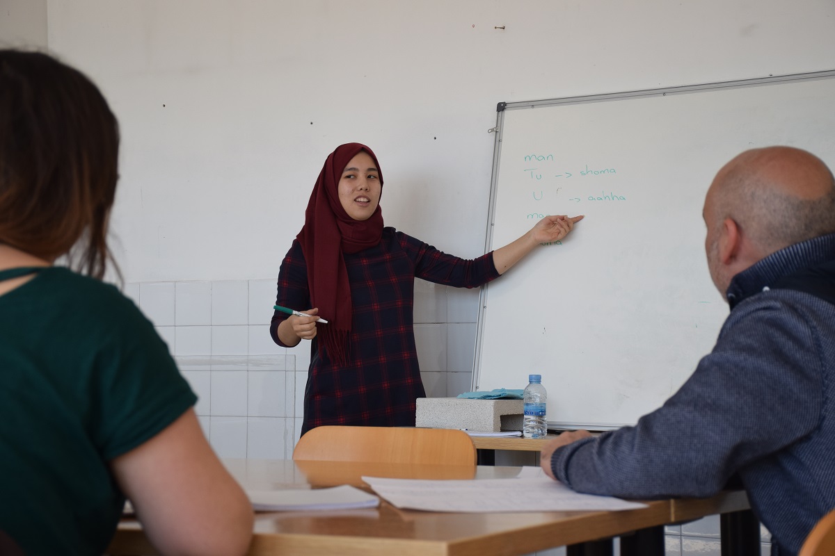 Actualment hi ha tres alumnes en període de formació: un marroquí que ensenyarà dàrija (modalitat de l’àrab), un gambià que ensenyarà wòlof i la Zuhal Ata, una noia de Kabul que impartirà dari. La Zuhal, de 21 anys, es va apuntar al projecte perquè li agraden molt els idiomes i perquè, segons diu, “ensenyar és una manera d’aprendre”. Fa un any i mig que va arribar a Catalunya i estudia un cicle formatiu de Documentació sanitària a Sant Joan de Déu. Diu que el dari és “menys difícil del que sembla”, cosa que corroboren els dos alumnes voluntaris que li fan d’espàrring en la seva formació com a professora de la llengua: l’Arantxa, lingüista; i en Carles, periodista.